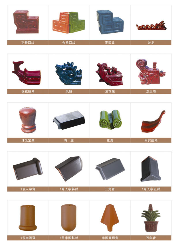 公司主要生產(chǎn)品種有:琉璃瓦系列、陶瓷瓦系列、石板瓦系列、平板瓦系列、西班牙瓦系列、S瓦系列、圓筒瓦系列、仿古瓦系列以及各類屋脊走獸、花窗欄桿等。宜興琉璃瓦質(zhì)地優(yōu)良,規(guī)格齊全,造型古樸典雅,釉色豐富多彩, 富有濃郁的民族特色。如西班牙瓦,S瓦,造型起伏多變,具有古典的南歐風(fēng)格,鋪蓋后自然高雅,格調(diào)獨(dú)特,適合西式風(fēng)格的建筑;圓筒瓦系列,造型簡(jiǎn)樸平實(shí)。融合了東方文化的風(fēng)土色彩,鋪蓋后秀麗大方,輕盈淳樸,適合中國古典建筑。