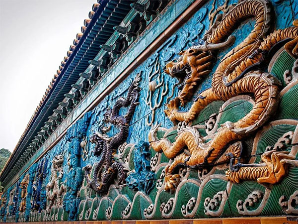 在紫禁城內(nèi)九條龍采用藍、紫、黃、白、黑等色,重色深沉敦厚,淺色明媚婉麗。琉璃壁的下層,以綠色表達海浪的深邃,以白色點明凌空盡濺的浪花,形成了瞬息萬變的激浪,又以近水襯托遠水,以遠水近浪共同襯托九龍,使整個畫面看上去雄偉壯闊,仿佛能聽到巨龍的長嘶和海水的咆哮。